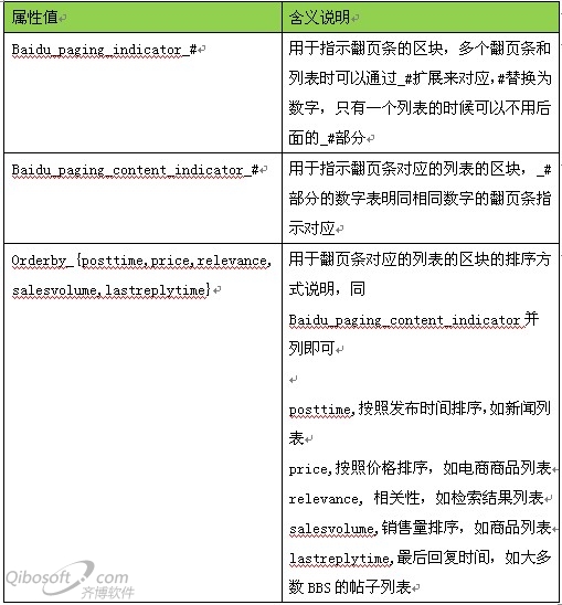 對(duì)翻頁(yè)條對(duì)應(yīng)的區(qū)塊元素p可以設(shè)置class屬性Baidu_paging_indicator,對(duì)該翻頁(yè)條對(duì)應(yīng)的主體鏈接的區(qū)塊元素div,設(shè)置 Baidu_paging_content_indicator Orderby_posttime,這樣翻頁(yè)條和對(duì)應(yīng)的鏈接區(qū)塊就對(duì)應(yīng)起來(lái),并且告知了百度是按照發(fā)布時(shí)間排序的,從而可以優(yōu)化spider系統(tǒng)的抓取行 為,改善站點(diǎn)的收錄效果。
