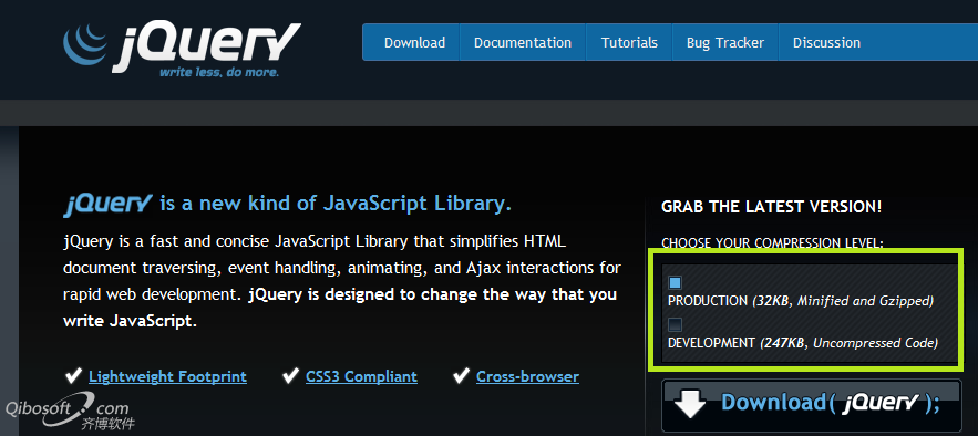1.3我們看一下jquery官網(wǎng),開發(fā)版本大小是247KB,min版只有32KB。整整壓縮了88%。