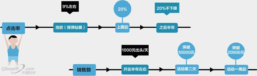 “今天老板娘生日,全場(chǎng)29元起,滿50元包郵”荒誕的促銷理由,加L簡(jiǎn)單粗糙的促銷banner.可謂是山寨味十足。但當(dāng)該banner圖被應(yīng)用到鉆展時(shí),卻引來(lái)了無(wú)數(shù)的眼球,兒乎包斷鉆展背彈。店鋪的各項(xiàng)數(shù)據(jù)也因此飆升,具體可看以下數(shù)據(jù):