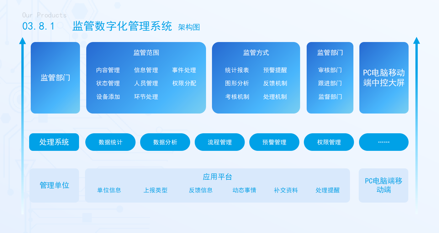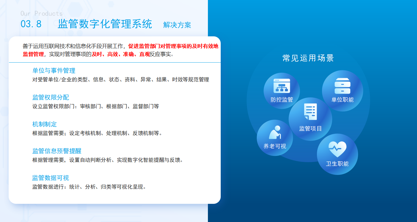 總結:數字化監管管理系統是一個集“對象管理、智能預警、流程協同、數據分析”于一體的綜合性監管解決方案。它不僅是工具,更是推動監管體系和監管能力現代化的“核心引擎”,助力監管部門在數字時代實現更高效、更公平、更智慧的治理。