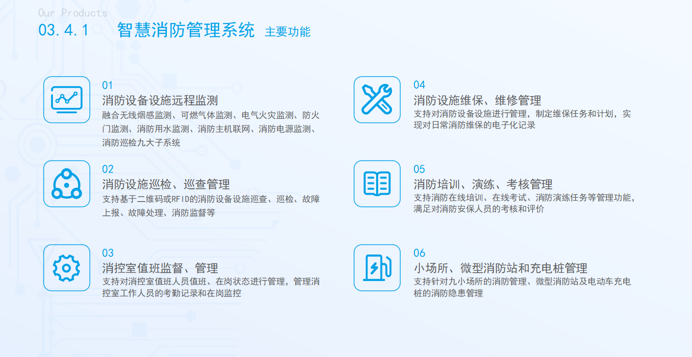 運用物聯網技術讓消防管理智慧化,實現設備遠程檢測、設備設施巡檢與巡查管理、設備設施維保、維修管理、值班室監督管理、培訓和演練考核管理等